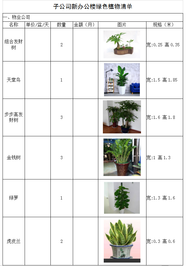 城投公司下屬子公司新辦公樓綠色植物租賃詢價(jià)函