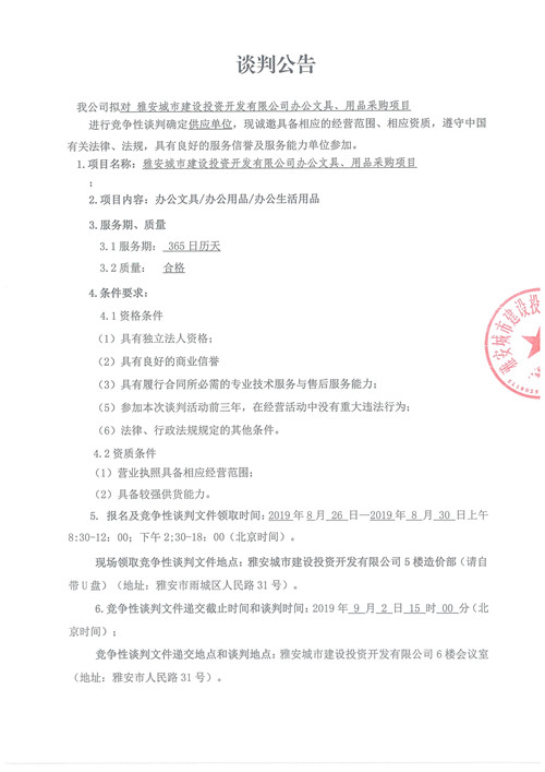 雅安城市建設(shè)投資開(kāi)發(fā)有限公司辦公文具、用品采購(gòu)項(xiàng)目競(jìng)爭(zhēng)性談判公告(第二次)