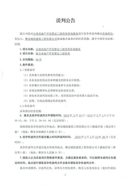 雅安城投建筑工程有限公司辦理房地產(chǎn)開發(fā)暫定三級資質咨詢服務競爭性談判公告