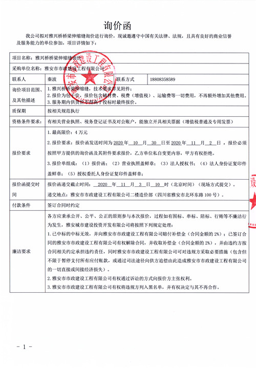 雅安市市政建設(shè)工程有限公司雅興橋橋梁伸縮縫詢(xún)價(jià)函