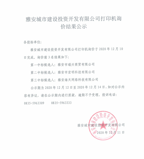 雅安城市建設(shè)投資開發(fā)有限公司打印機詢價結(jié)果公示