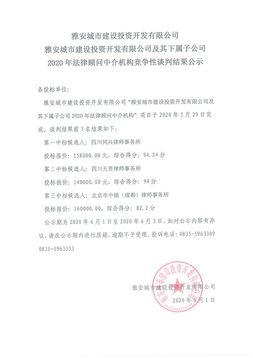 雅安城市建設(shè)投資開發(fā)有限公司及其下屬子公司2020年法律顧問中介機(jī)構(gòu)競(jìng)爭(zhēng)性談判結(jié)果公示