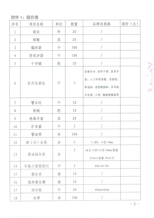 防汛應(yīng)急物資詢(xún)價(jià)函