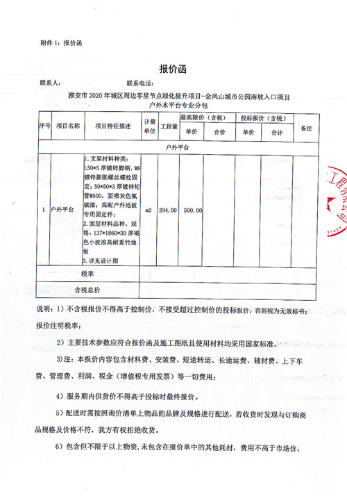 雅安市政公司金鳳山城市公園南坡入口項(xiàng)目-戶外平臺(tái)專業(yè)分包詢價(jià)函