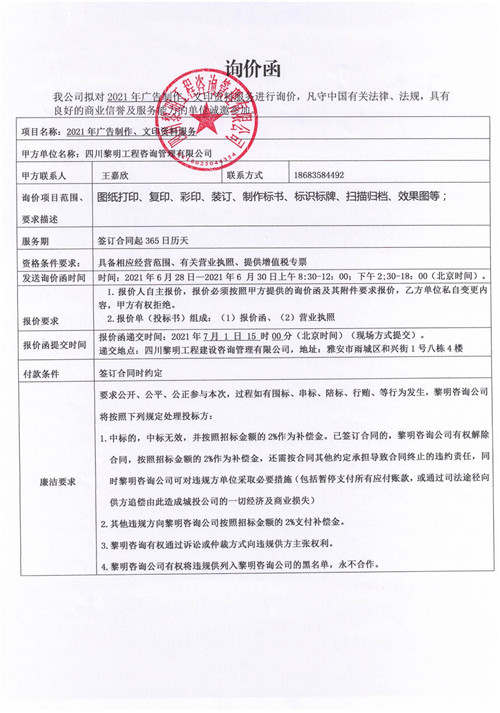 黎明咨詢公司2021年廣告制作、文印資料服務(wù)詢價(jià)函