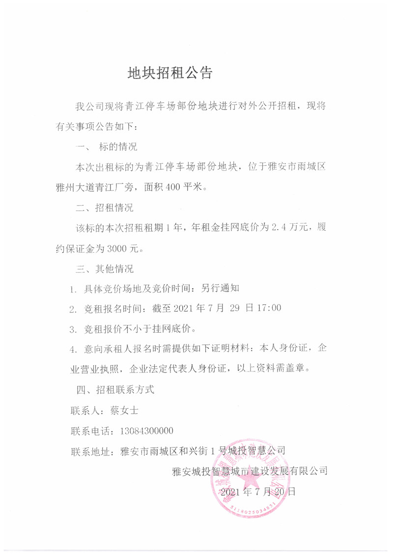 城投智慧公司青江停車場(chǎng)部分地塊招標(biāo)公告(400㎡)