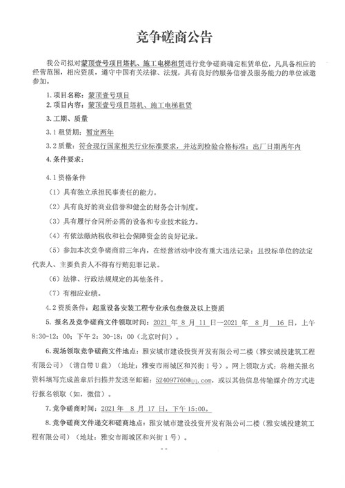 城投建工公司蒙頂壹號(hào)項(xiàng)目塔機(jī)、施工電梯租賃競爭磋商公告
