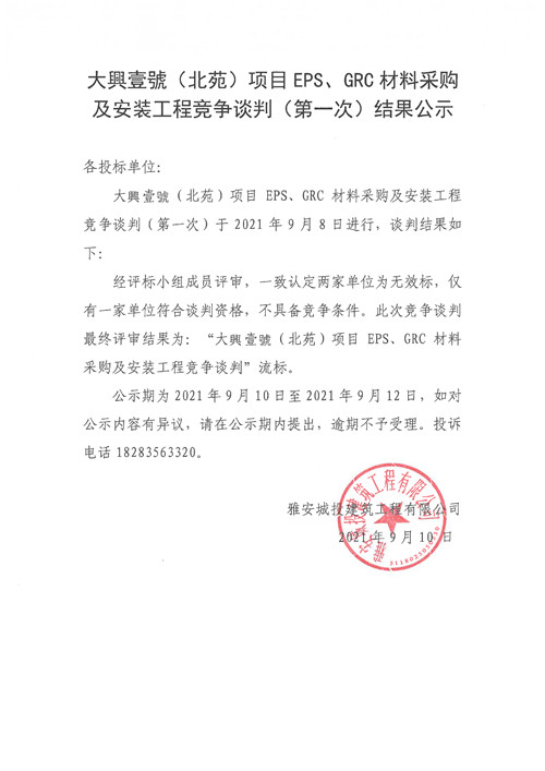 大興壹號(hào)(北苑)項(xiàng)目EPS、GRC材料采購及安裝工程競爭談判結(jié)果公示