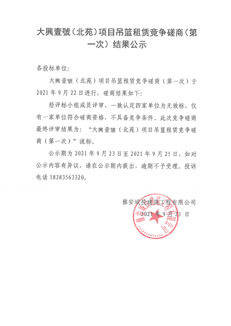 大興壹號(hào)(北苑)項(xiàng)目吊籃租賃競(jìng)爭(zhēng)性磋商(第一次)結(jié)果公示