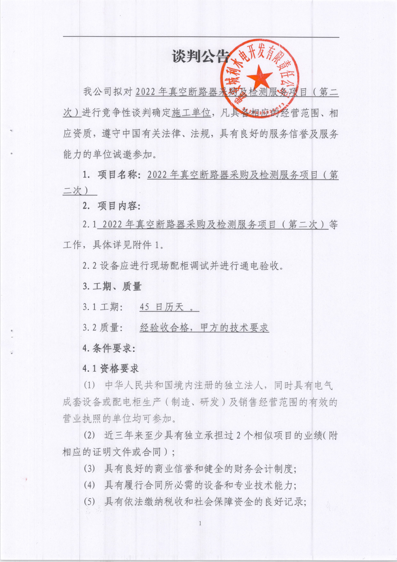 城利水電公司2022年真空斷路器采購及檢測服務(wù)項目(第二次)競爭性談判