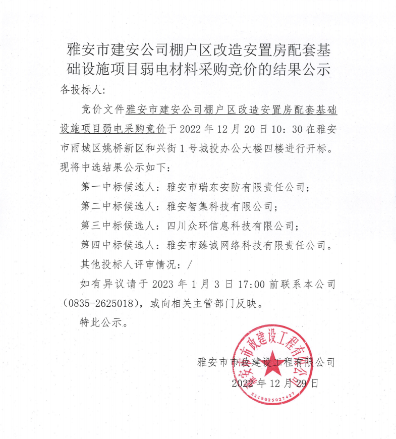 雅安市建安公司棚戶(hù)區(qū)改造安置房配套基礎(chǔ)設(shè)施項(xiàng)目弱電材料采購(gòu)競(jìng)價(jià)結(jié)果公示