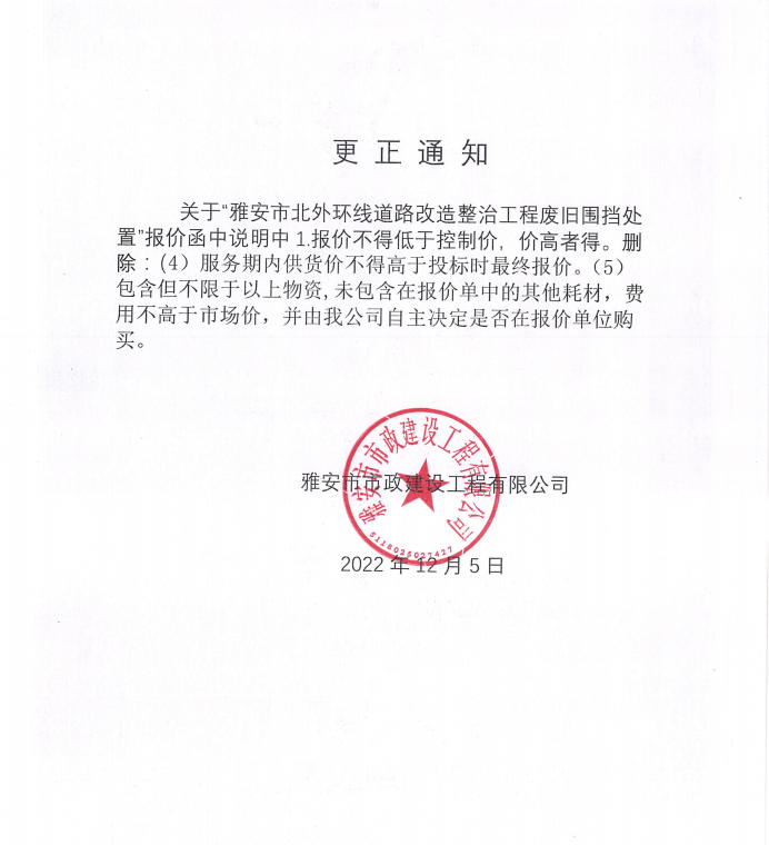 雅安市北外環(huán)道路改造整治工程廢舊圍擋處置詢(xún)價(jià)公告(更正通知)