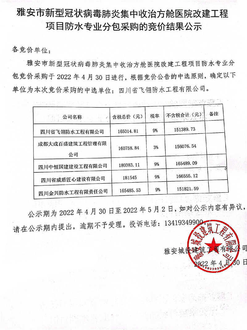 雅安市新型冠狀病毒肺炎集中收治方艙醫(yī)院改建工程項目防水專業(yè)分包采購的競價結(jié)果公示