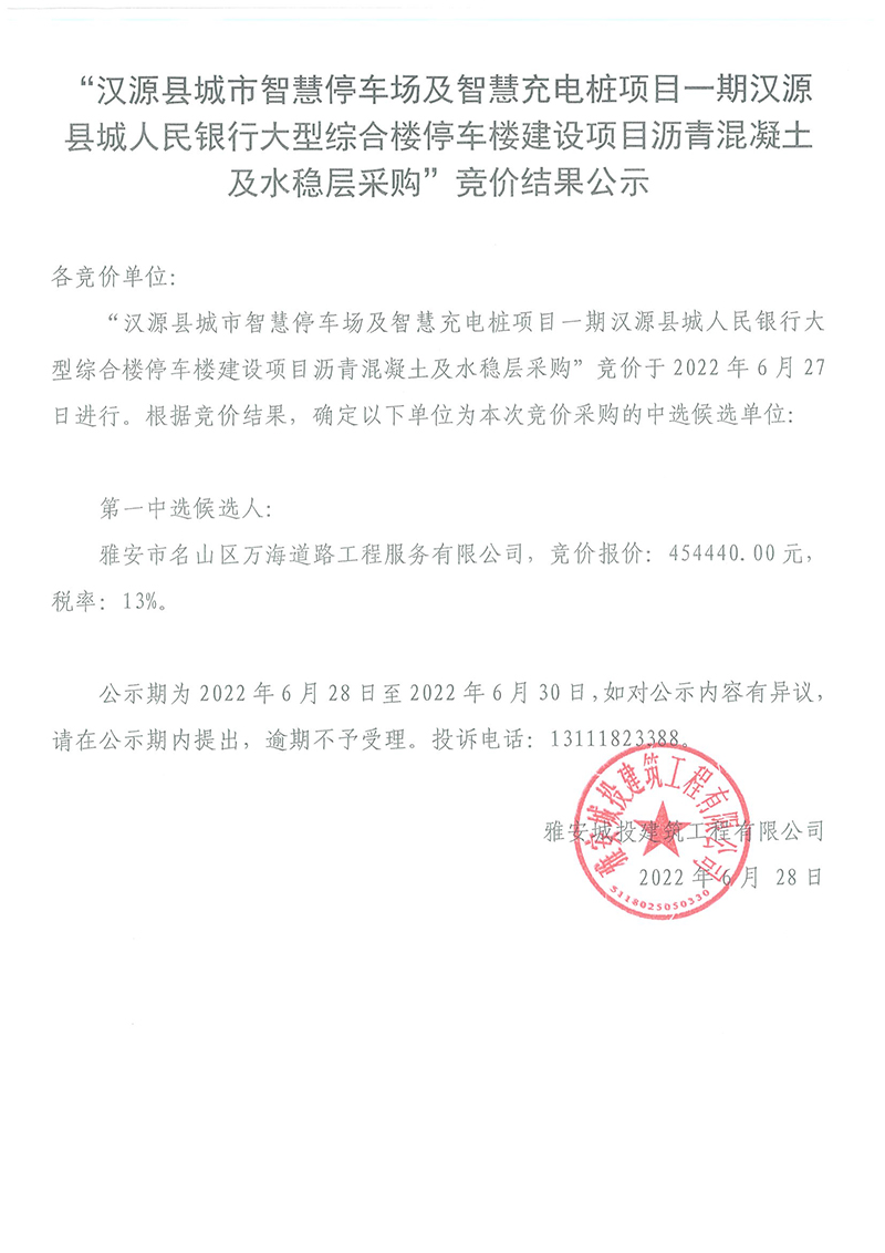 漢源縣城市智慧停車場及智慧充電樁項(xiàng)目一期漢源縣城人民銀行大型綜合樓停車樓建設(shè)項(xiàng)目瀝青混凝土、水穩(wěn)層采購競價(jià)結(jié)果公告