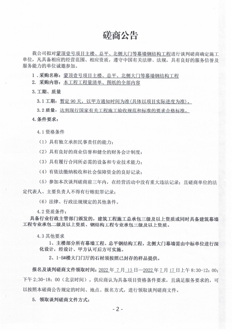 蒙頂壹號(hào)項(xiàng)目主樓、總坪、北側(cè)大門(mén)幕墻鋼結(jié)構(gòu)工程談判磋商公告