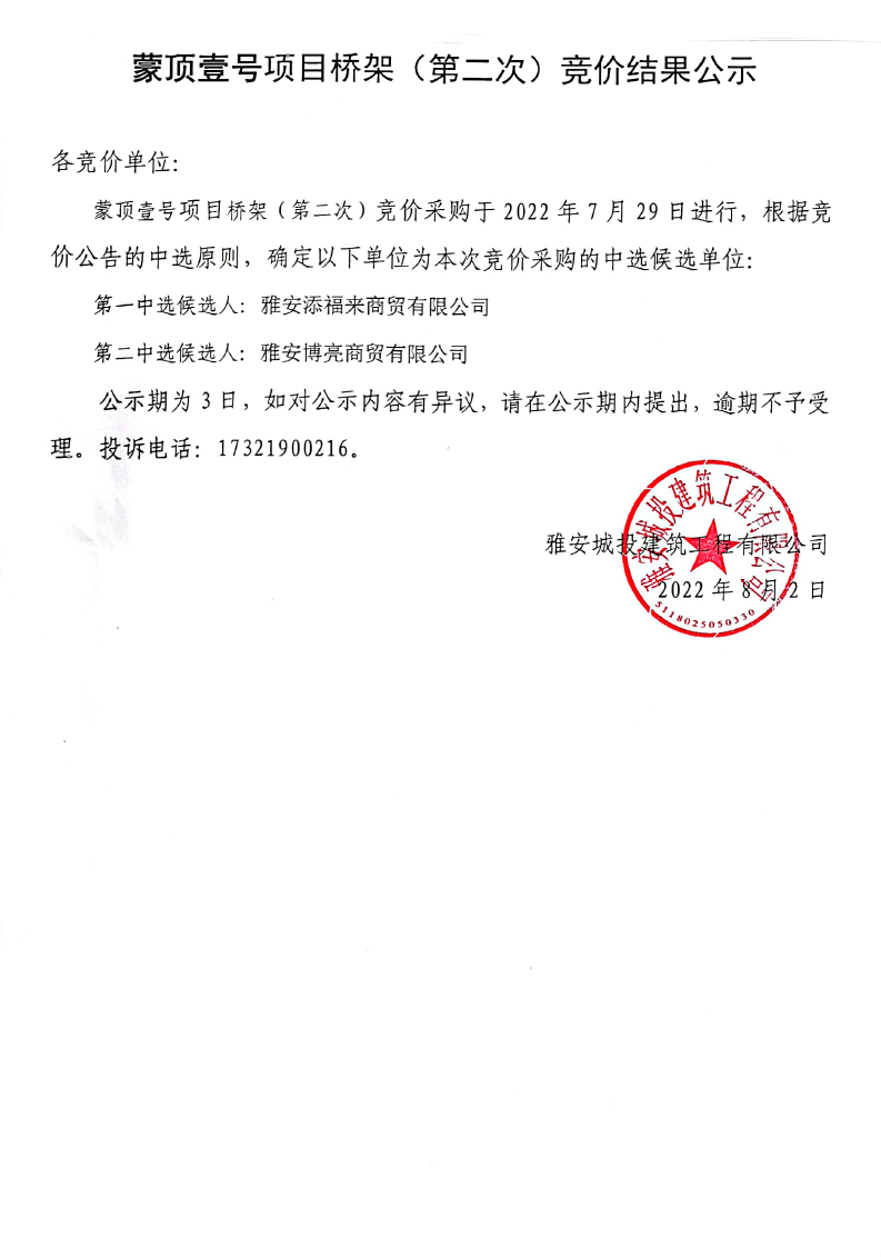 蒙頂壹號項目橋架(第二次)競價結果公示
