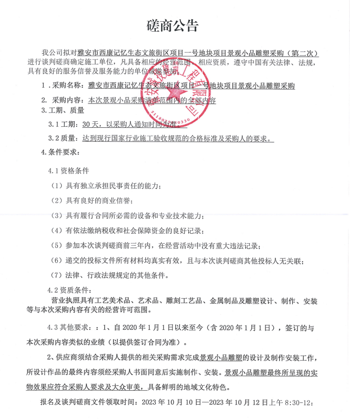 雅安市西康記憶生態(tài)文旅街區(qū)項目一號地塊項目景觀小品雕塑采購(第二次)談判磋商公告