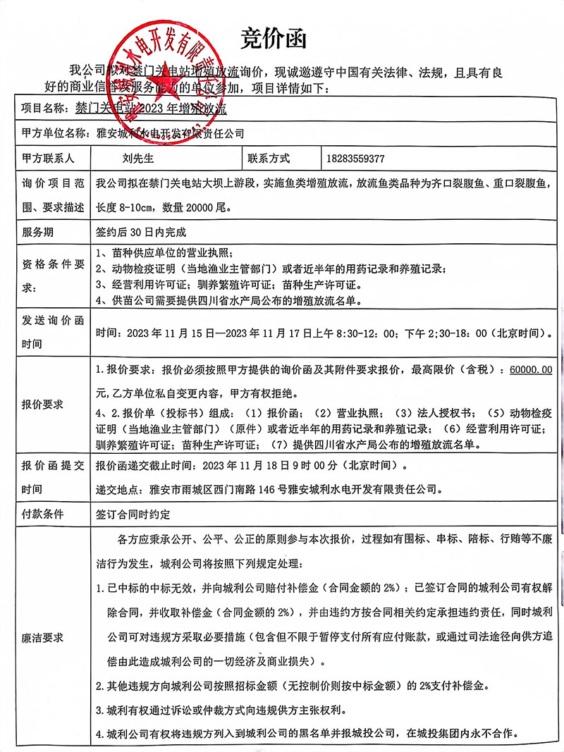 禁門關(guān)電站2023年增殖放流競價公告