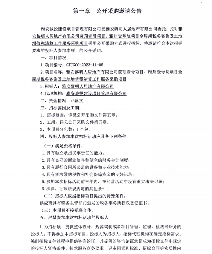 雅安黎明人居地產(chǎn)有限公司蒙頂壹號項目、雅州壹號院項目全周期稅務咨詢及土地增值稅清算工作服務采購項目公開采購邀請公告