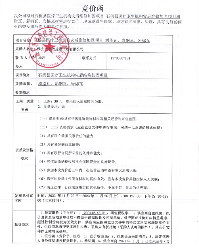 石棉縣醫(yī)療衛(wèi)生機構(gòu)災(zāi)后維修加固改造項目采購樹脂瓦、彩鋼瓦、巖棉瓦材料競價公告