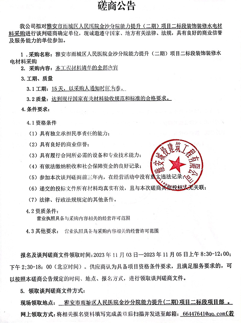 雅安市雨城區(qū)人民醫(yī)院金沙分院能力提升(二期)項(xiàng)目二標(biāo)段裝飾裝修水電材料采購(gòu)談判磋商公告