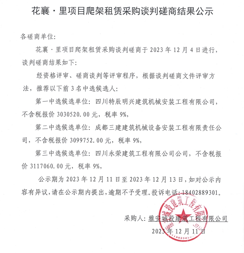 花襄·里項目爬架租賃采購談判磋商結果公示