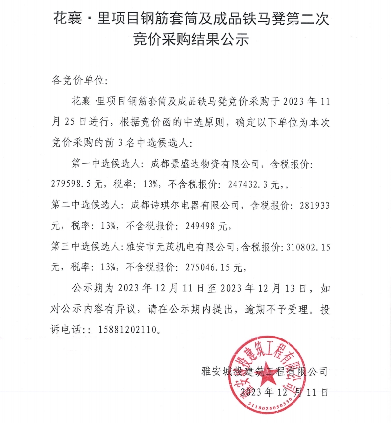 花襄·里項(xiàng)目鋼筋套筒及成品鐵馬凳第二次競(jìng)價(jià)采購(gòu)結(jié)果公示