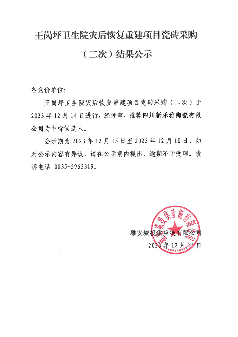 王崗坪衛(wèi)生院災(zāi)后恢復(fù)重建項(xiàng)目瓷磚采購(gòu)(二次)結(jié)果公示