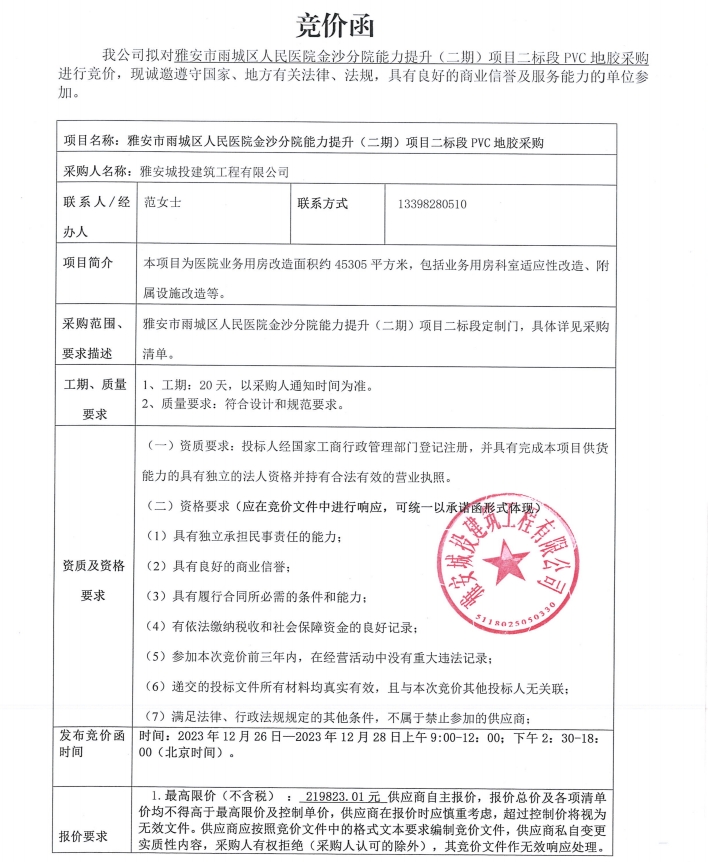 雅安市雨城區(qū)人民醫(yī)院金沙分院能力提升(二期)項目二標(biāo)段PVC地膠采購競價公告