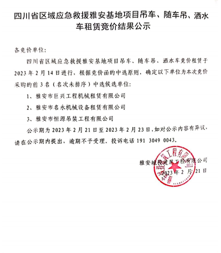 四川省區(qū)域應(yīng)急救援雅安基地項目吊車、隨車吊、灑水車租賃競價結(jié)果公示