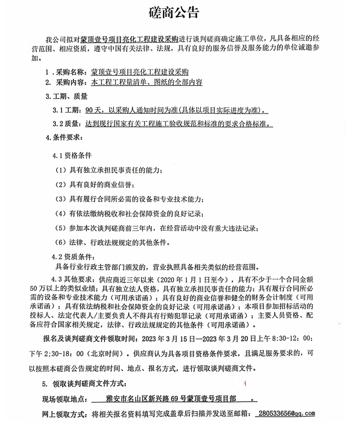 蒙頂壹號項目亮化工程建設(shè)采購磋商公告