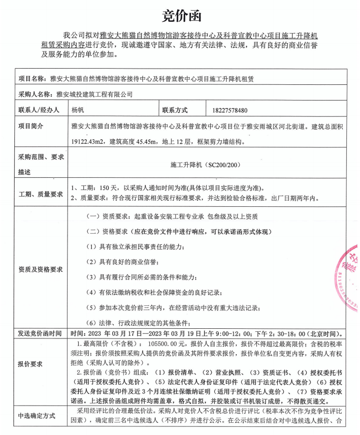 雅安大熊貓自然博物館游客接待中心及科普宣教中心項(xiàng)目施工升降機(jī)租賃采購競價公告