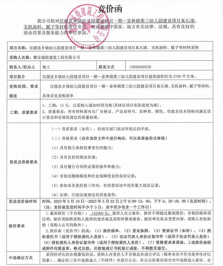 漢源縣鄉(xiāng)鎮(zhèn)幼兒園建設項目一期一富林鎮(zhèn)第三幼兒園建設項目真石漆、無機涂料、膩子等材料采購競價公告
