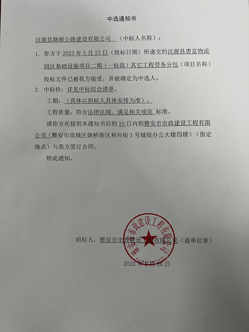 漢源縣唐富物流園區(qū)基礎(chǔ)設(shè)施項目二期(一標(biāo)段)其它工程勞務(wù)分包中選通知書