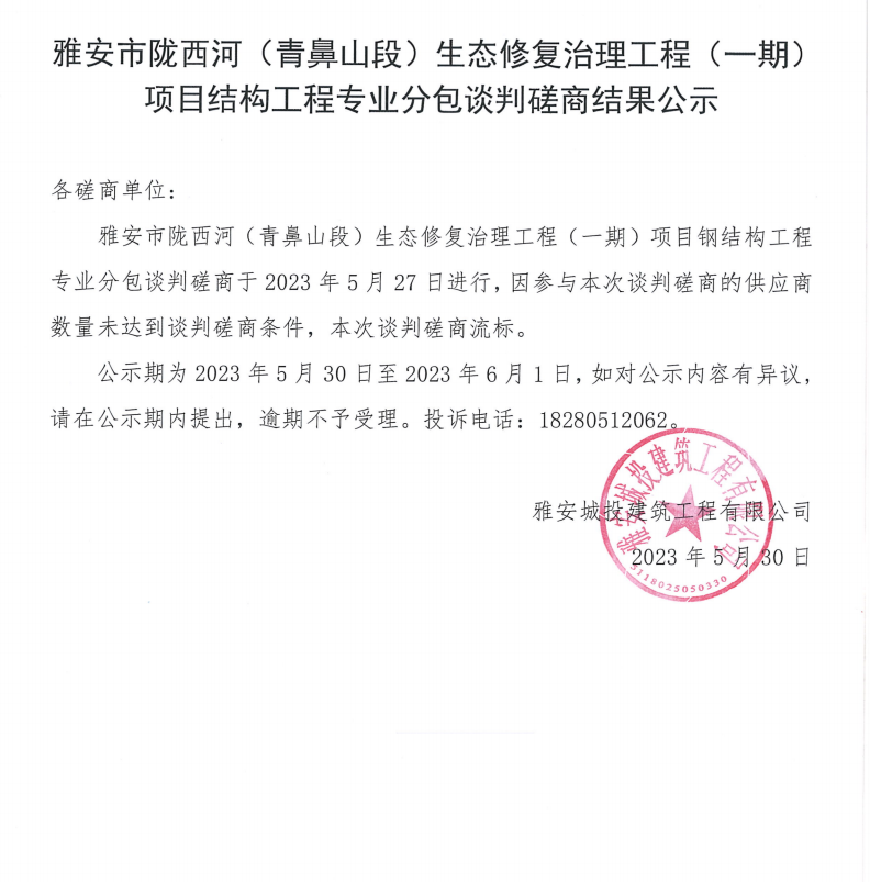 雅安市隴西河(青鼻山段)生態(tài)修復(fù)治理工程(一期)項(xiàng)目鋼結(jié)構(gòu)工程專業(yè)分包談判磋商結(jié)果公示