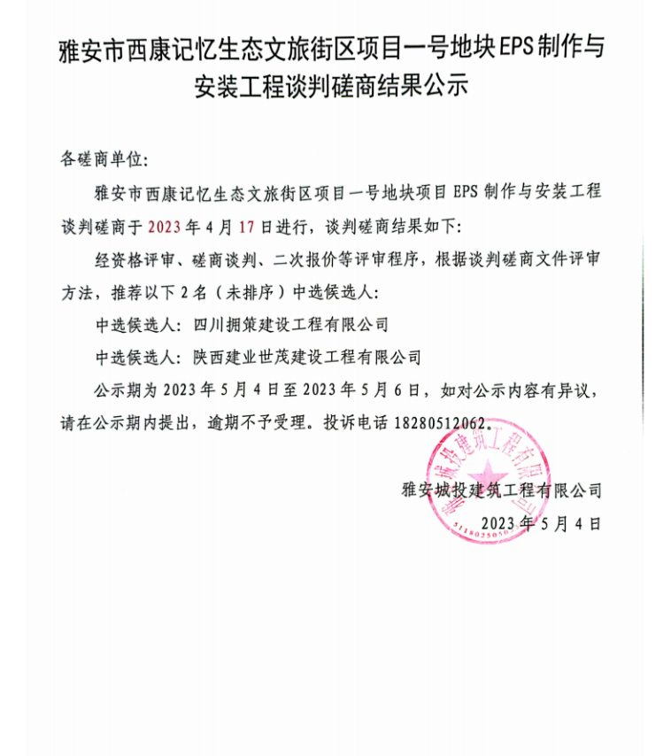 雅安市西康記憶生態(tài)文旅雅安市西康記憶生態(tài)文旅街區(qū)項(xiàng)目一號地塊EPS制作與安裝工程談判磋商結(jié)果公示