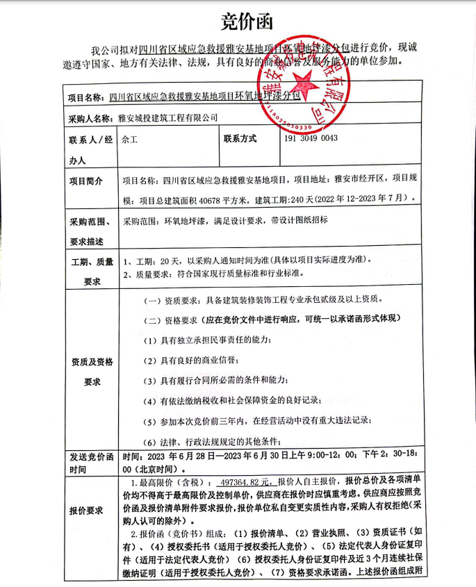 四川省區(qū)域應(yīng)急救援雅安基地項(xiàng)目環(huán)氧地坪漆分包競價(jià)公告