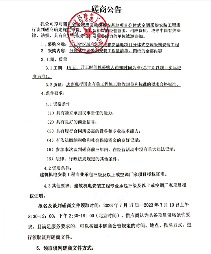 四川省區(qū)域應(yīng)急救援雅安基地項(xiàng)目分體式空調(diào)采購安裝工程談判磋商公告