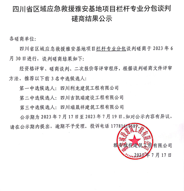 四川省區(qū)域應(yīng)急救援雅安基地項(xiàng)目欄桿專業(yè)分包談判磋商結(jié)果公示