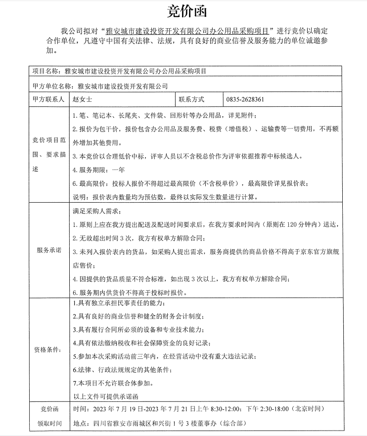 雅安城市建設(shè)投資開(kāi)發(fā)有限公司辦公用品采購(gòu)項(xiàng)目競(jìng)價(jià)公告