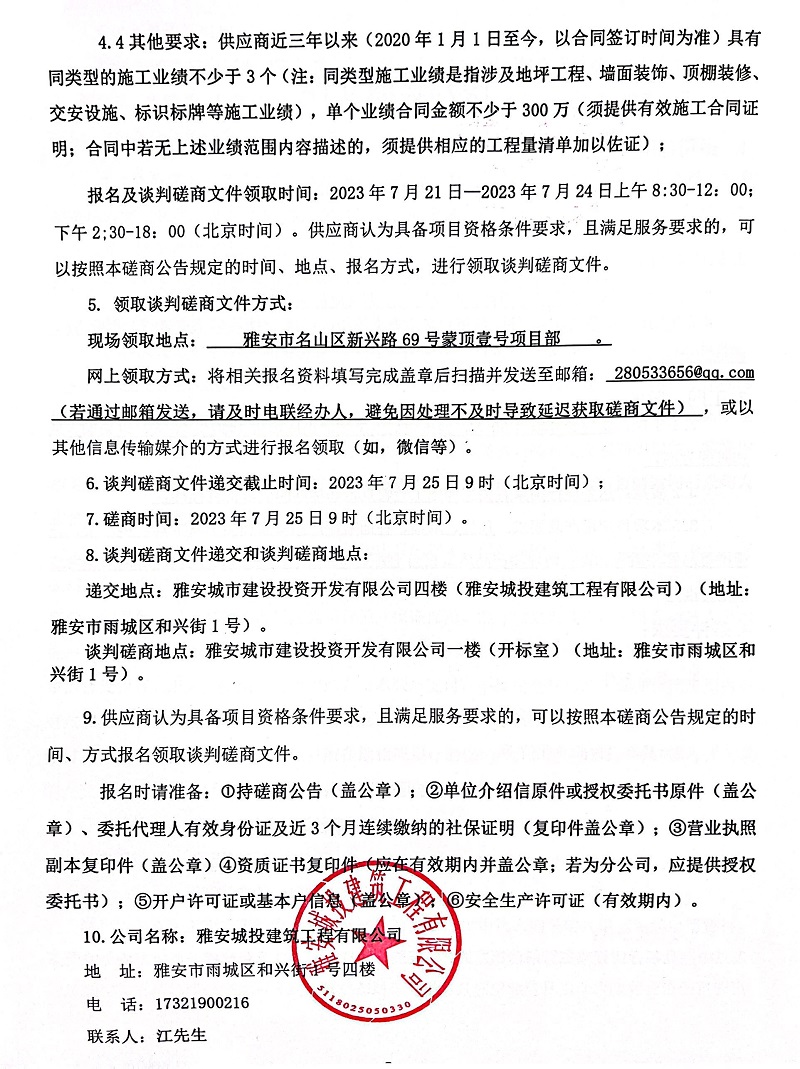 蒙頂壹號(hào)項(xiàng)目、西康記憶生態(tài)文旅街區(qū)項(xiàng)目1#地塊地下室裝修工程談判磋商公告