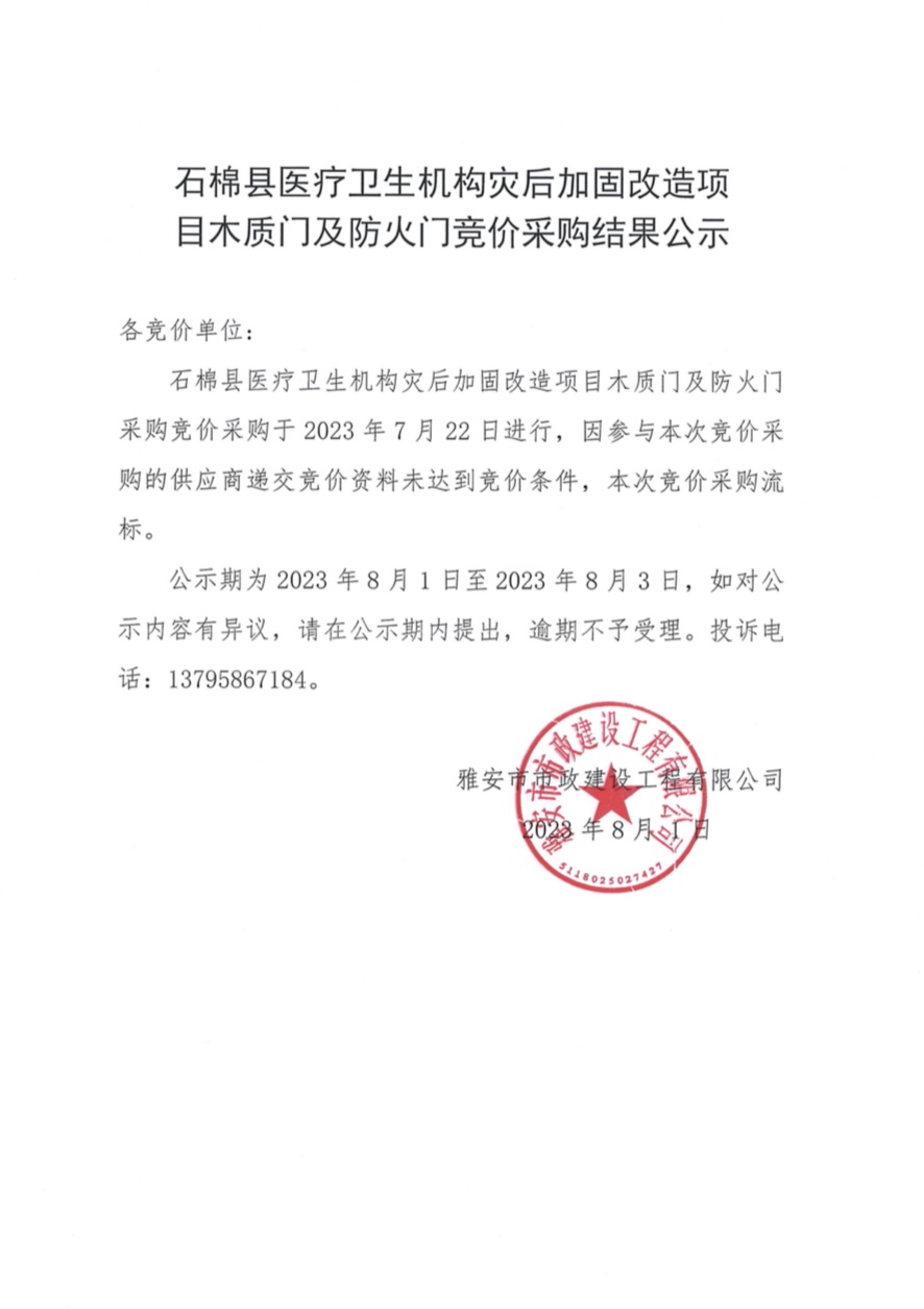 石棉縣醫(yī)療衛(wèi)生機(jī)構(gòu)災(zāi)后加固改造項(xiàng)目木質(zhì)門及防火門競(jìng)價(jià)采購結(jié)果公示