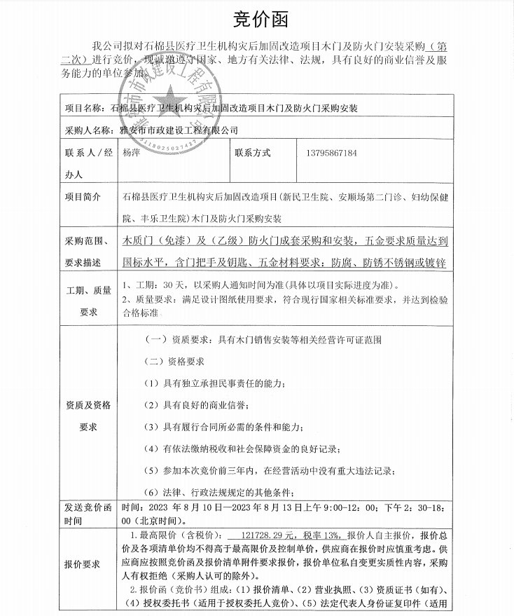 石棉縣醫(yī)療衛(wèi)生機構(gòu)災(zāi)后加固改造項目木門及防火門安裝采購(第二次)競價公告