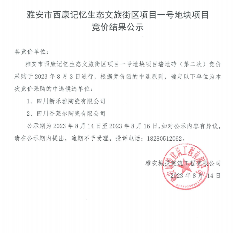 雅安市西康記憶生態(tài)文旅街區(qū)項目一號地塊項目墻地磚(第二次)競價結(jié)果公示
