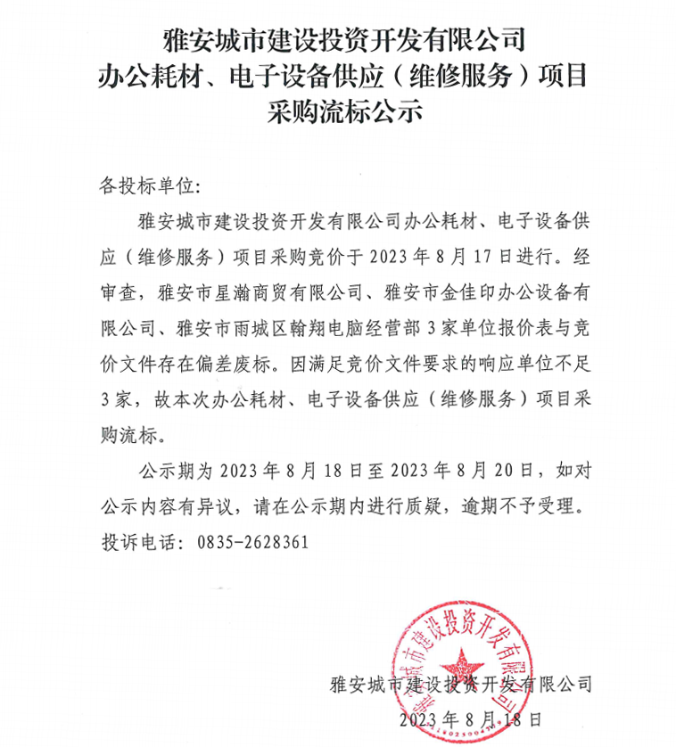 雅安城市建設投資開發(fā)有限公司辦公耗材、電子設備供應(維修服務)項目采購流標公示