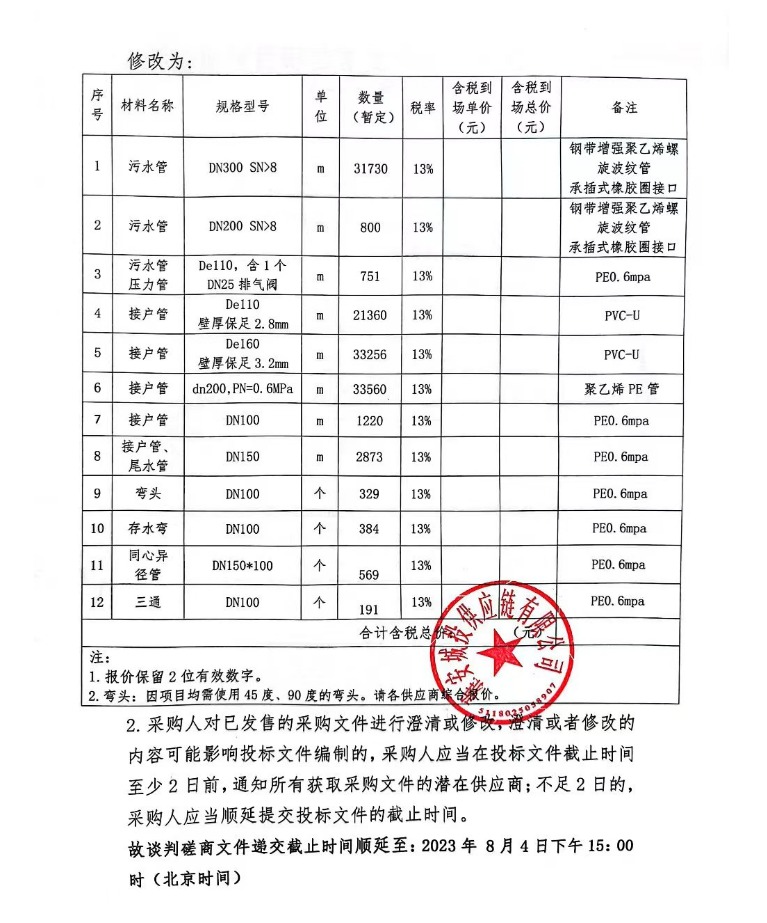生活污水處理設(shè)施恢復(fù)重建項目管材材料采購補遺(一)