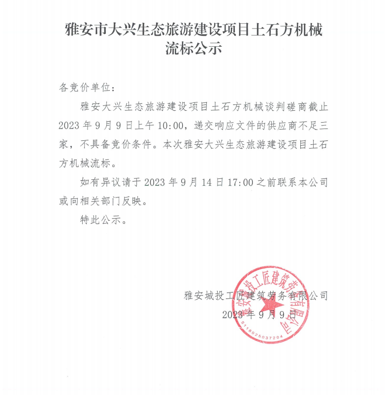 雅安市大興生態(tài)旅游建設(shè)項(xiàng)目土石方機(jī)械流標(biāo)公示