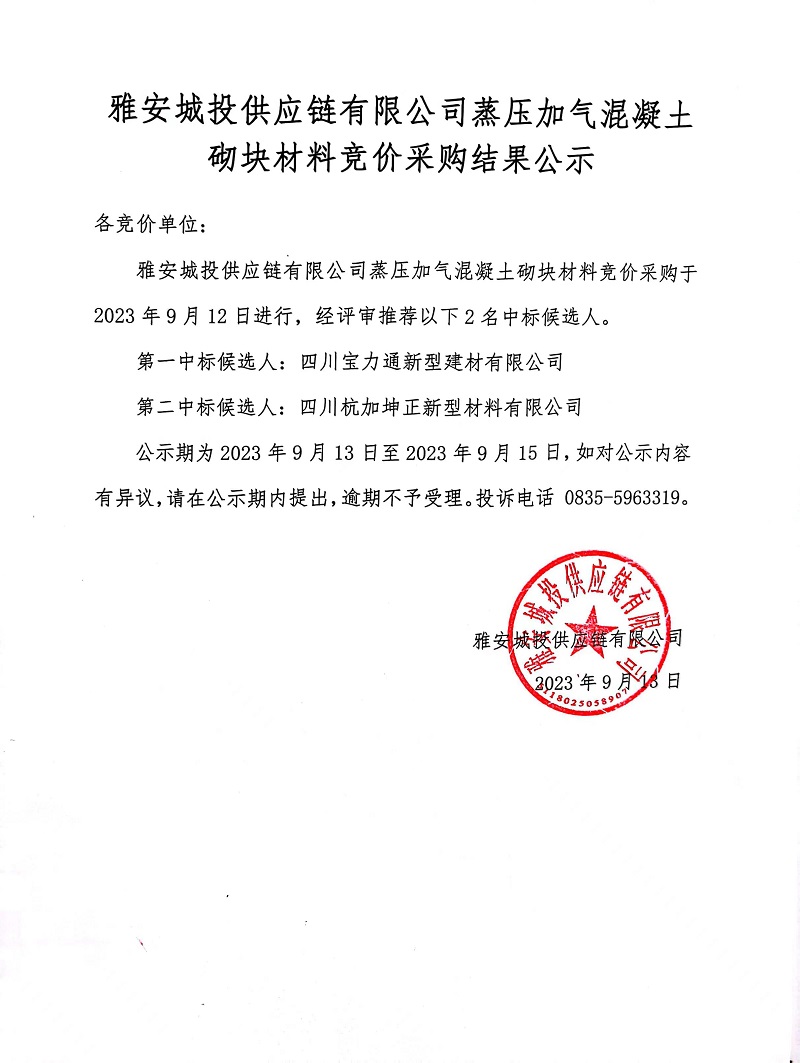 雅安城投供應(yīng)鏈有限公司蒸壓加氣混凝土砌塊材料競價(jià)采購結(jié)果公示