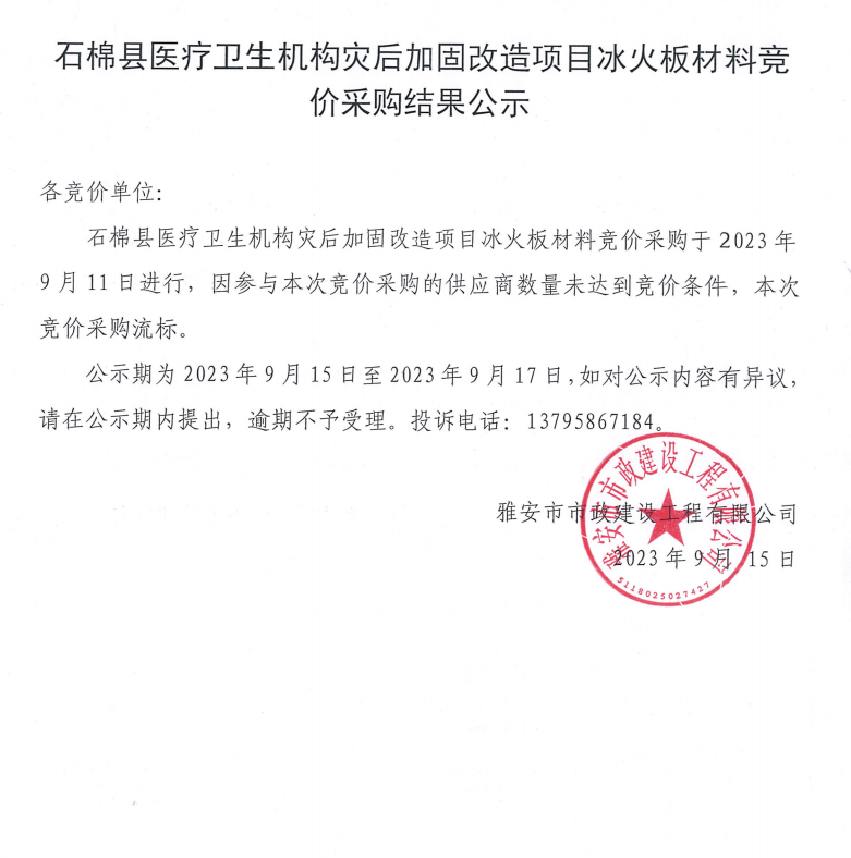 石棉縣醫(yī)療衛(wèi)生機構(gòu)災(zāi)后加固改造項目冰火板材料競價采購結(jié)果公示