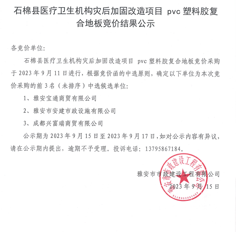 石棉縣醫(yī)療衛(wèi)生機構災后加固改造項目pvc塑料膠復合地板采購競價結果公示